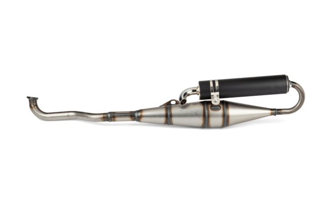 - An den Krümmer schließt sich der eigentliche Auspuff-Körper an. Bei einem klassischen 2-Takt Resonanzauspuff werden hier die Resonanzwellen so genutzt, dass die Leistung des Motors verbessert werden kann.
