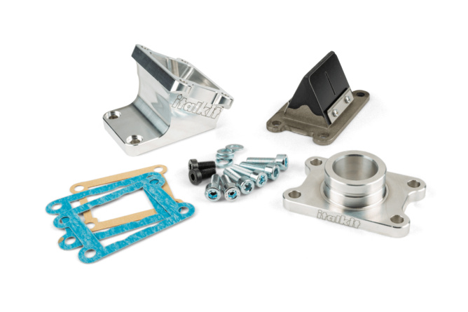 Italkit Einlasskit Oversize für Derbi Variant Start, für die Leistungsmaximierung von getunten Motoren. Der Satz enthält einen CNC Alu Membrankasten, einen Big Valve Membranblock mit Karbonplättchen, einen Ansaugstutzen aus Aluminium und alle für den Einbau erforderlichen Teile.
