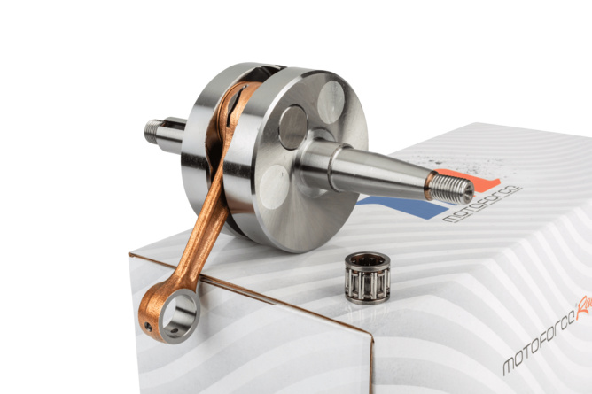 Die verstärkte Vollwangen-Kurbelwelle aus gehärtetem Stahl wird mit einem verstärkten 12x17x15mm Kolbenbolzenlager geliefert (original 12x15x15mm). Ebenfalls verstärkt ist der Kurbelzapfen mit 18mm (statt 16mm) Durchmesser.