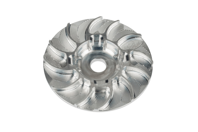 Von 2Fast können wir euch eine CNC-gefertigte High-End Riemenscheibe für Piaggio Motoren anbieten. Die Riemenscheibe wird komplett aus dem vollen gefräst und besteht aus hochwertigstem Aluminium. Dadurch wird maximale Stabilität mit minimalem Gewicht und somit auch minimaler rotierender Masse vereint. Die eingefrästen Kühlschaufeln sorgen zudem für optimale Wärmeableitung und Kühlung der kompletten Variomatik.