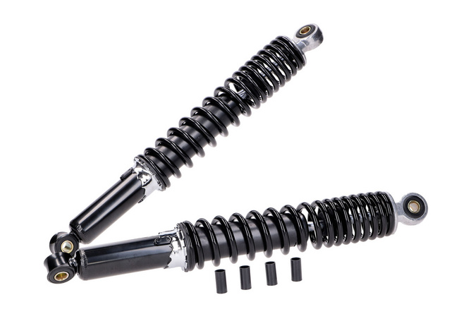 2er Set Stoßdämpfer hinten in 360mm Länge, hochwertiger Ersatz für Mofas, Mopeds und kleine Motorräder entwickelt. Die robuste Bauweise sorgt für eine zuverlässige Funktion und erhält Stabilität sowie Fahrkomfort. Die Kompatibilität mit vielen Modellen wird durch die mitgelieferten Reduzierbuchsen unterstützt, die eine einfache Anpassung an verschiedene Befestigungsarten ermöglichen.