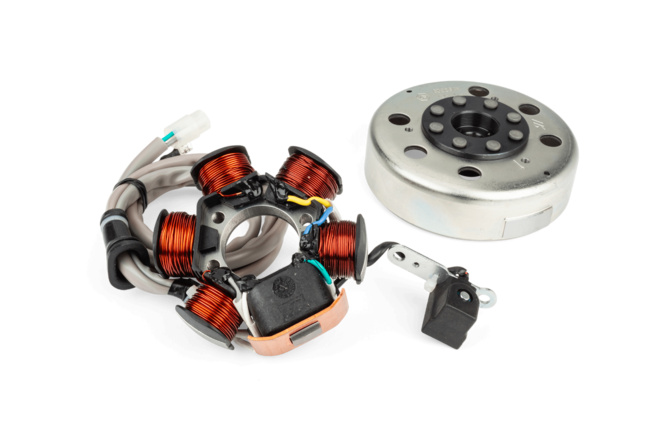 Während die meisten 50cc Motorräder und Roller mit Lichtmaschinen ausgestattet sind, die neben der Energie für den Zündfunken auch den Strom für die Fahrzeug-Beleuchtung erzeugt, gibt es auch Rennzündungen, wie man sie bei Motocross-Maschinen findet.